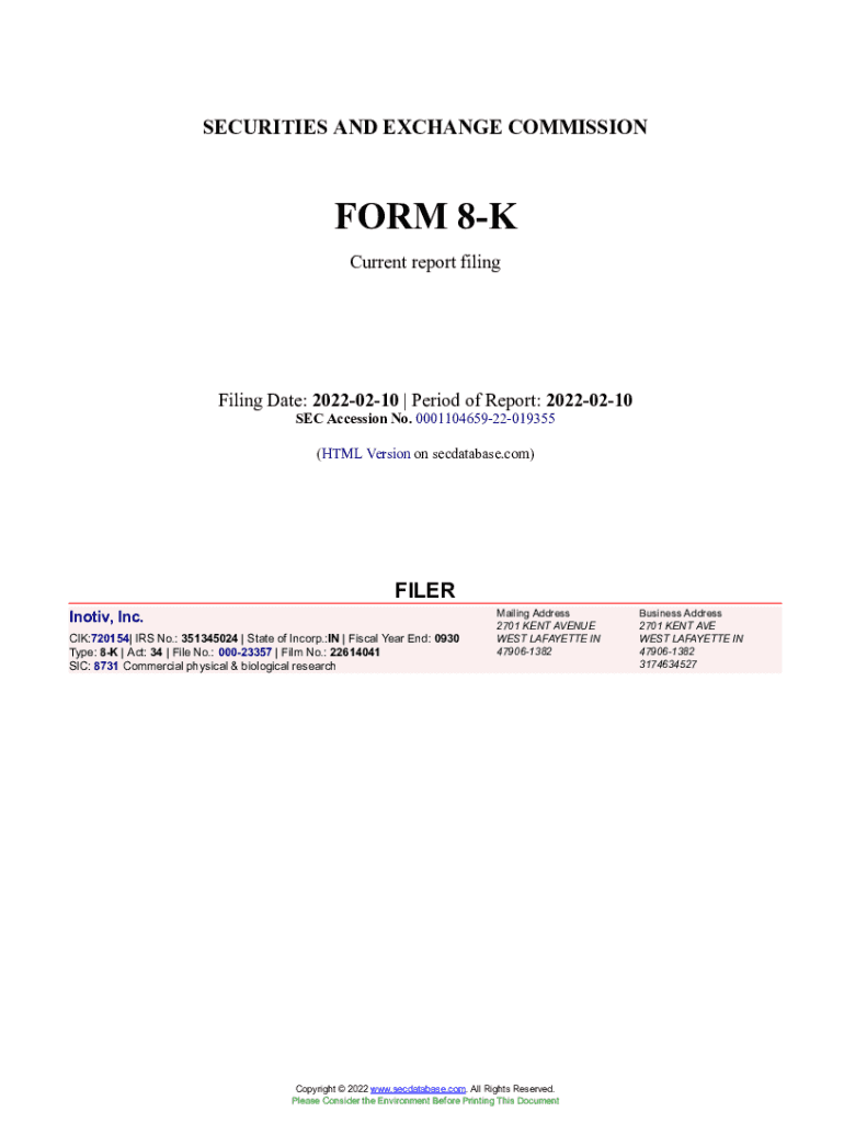 Get the free Inotiv, Inc. Form 8-K Current Event Report Filed 2022-02-10. Accession Number