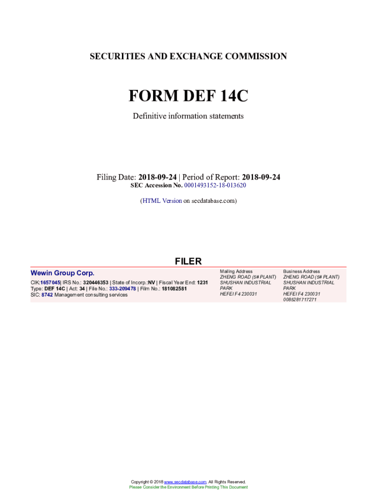 Get the free Wewin Group Corp. Form DEF 14C Filed 2018-09-24. Accession Number