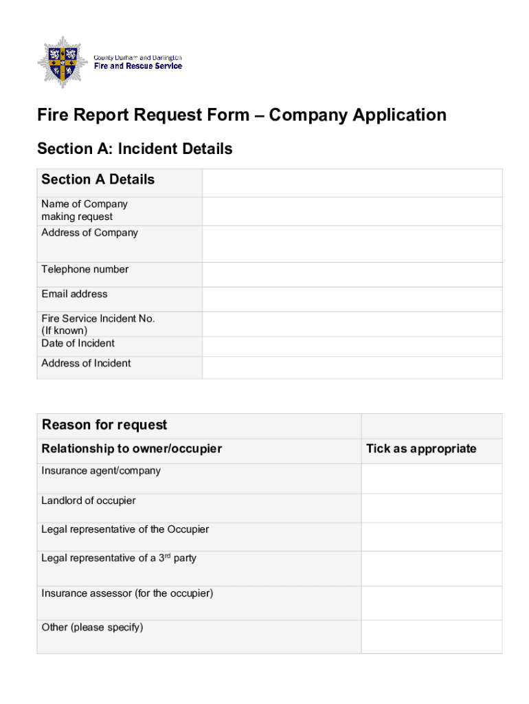 Fire Report Request Form Company Application Section A: Incident Details Section A Details Name of Company making request Address of Company Telephone number Email address Fire Service Incident No.