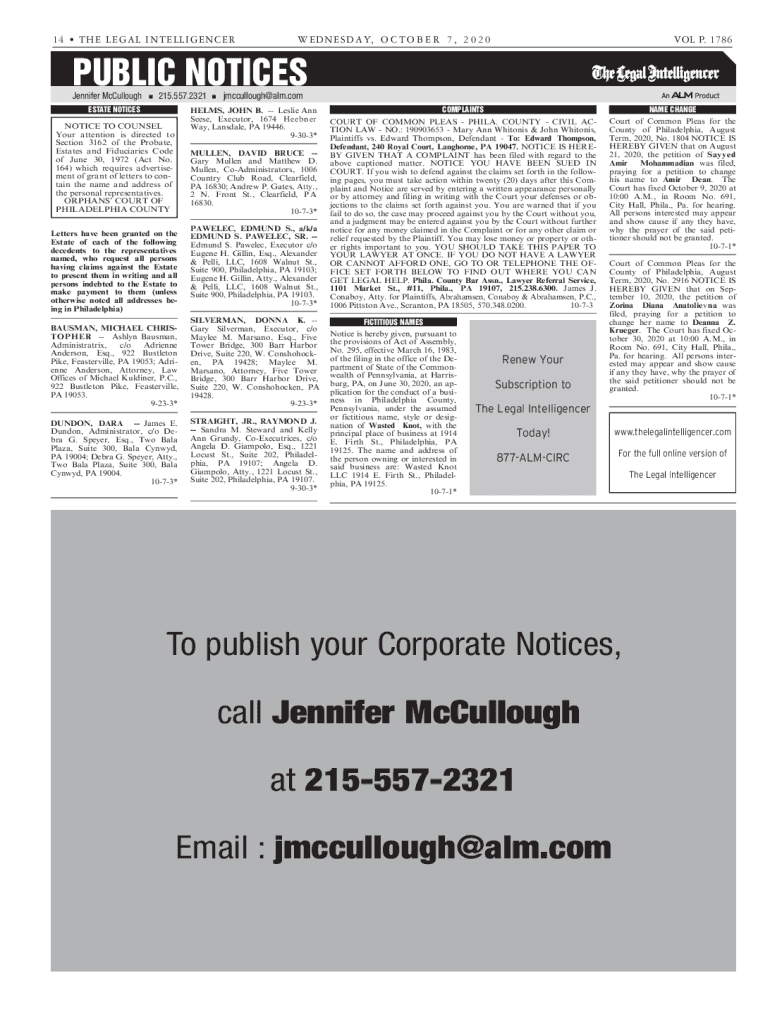 1 4 THE LEGAL L INTO LL IGE NCE RAW E DN E SD A Y, O C T O B E R 7, 2 0 2 0VOL P. 1786PUBLIC NOTICES+FOODS. D$VMMPVHI215.557.ESTATE NOTICESKNDDVMMPVHI!BMNDPNHELMS, JOHN B. Leslie Ann Sees, Executor,