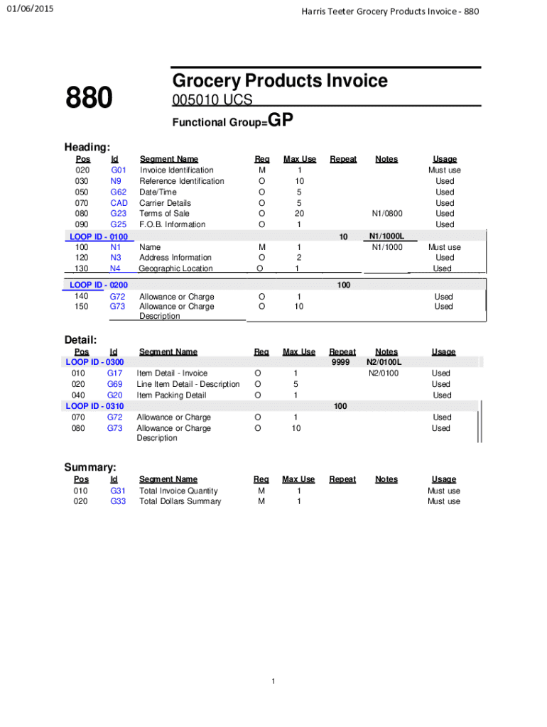 01/06/2015Harris Grocery Products Invoice 880 Harris Teeter Te880Grocery Products Invoice 005010 UCSGPFunctional Group Heading: Po's 020 030 050 070 080 090Id G01 N9 G62 CAD G23 G25LOOP ID 0100 100