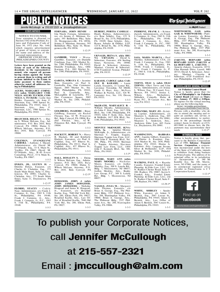 1 4 THE LEGAL L INTELLIGENCE E DN ES DAY, JA N UA RY 1 2, 2 0 2 2VOL P. 202PUBLIC NOTICES Jennifer McCullough215.557.2321ESTATE NOTICESNOTICE TO COUNSEL Your attention is directed to Section 3162