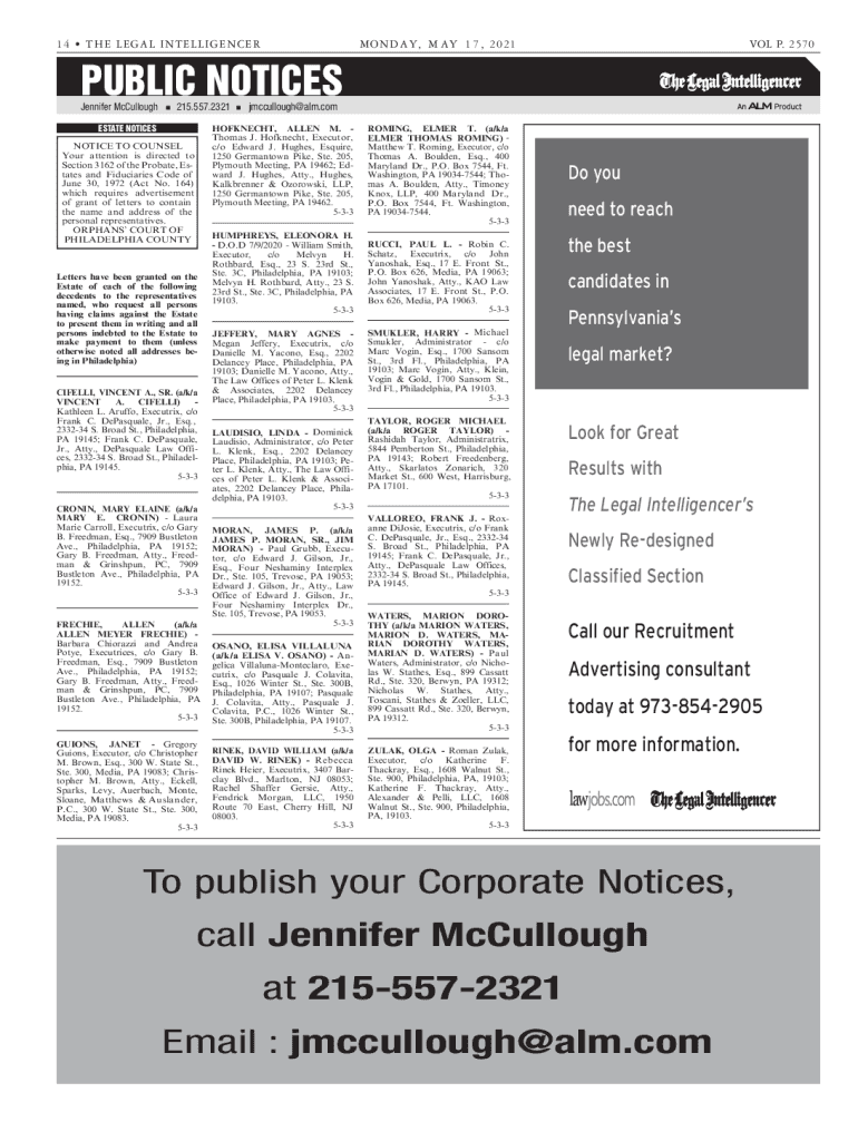 R 5)& &(\” */5&*(&/$&3 .0/ % \” :. \” : 701PUBLIC NOTICES+FOODS. D$VMMPVHI215.557.ESTATE NOTICESNOTICE TO COUNSEL Your attention is directed to Section 3162 of the Probate, Estates and Fiduciaries