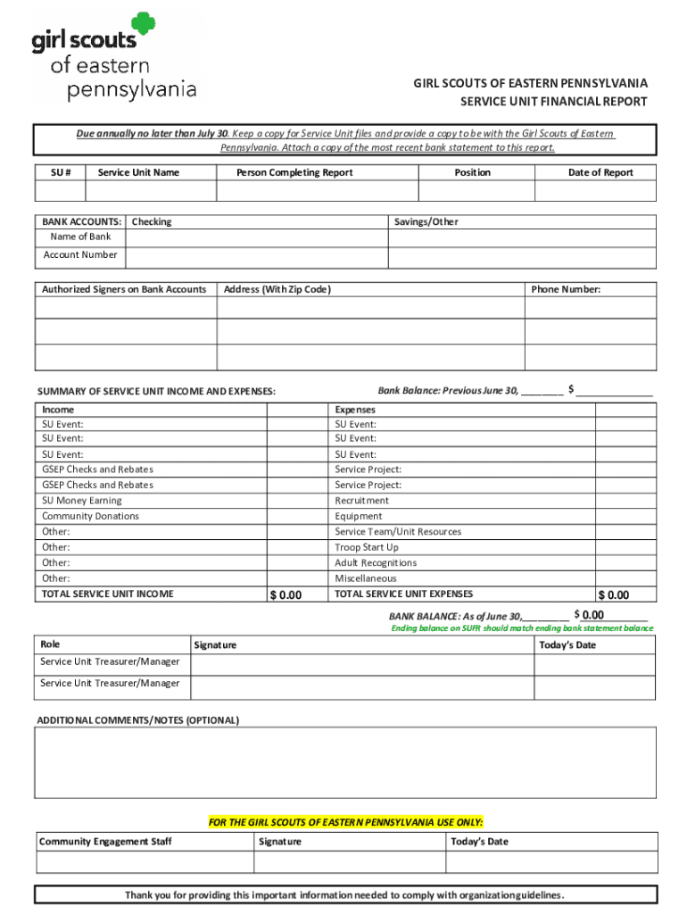 Due annually no later than July 30. Keep a copy for Service Unit files and provide a copy to be with the Girl Scouts of Eastern