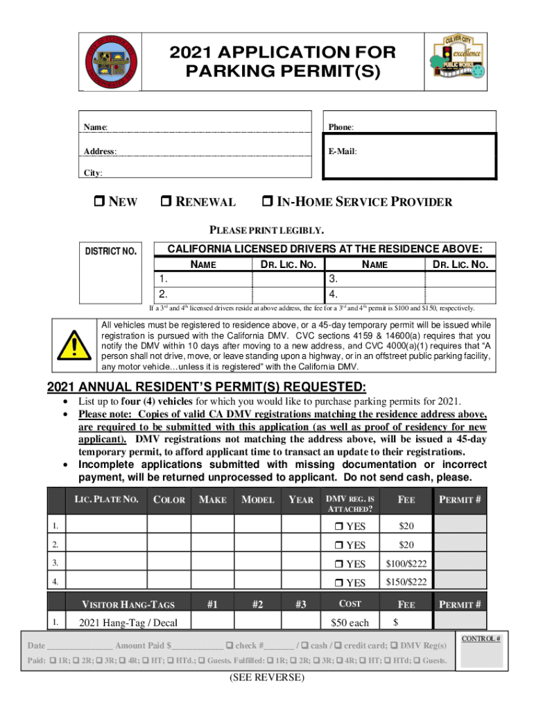 2021 APPLICATION FOR PARKING PERMIT(S)Name:Phone:Address:Email:City: NEW RENEWAL INCOME SERVICE PROVIDERPLEASE PRINT LEGIBLY. DISTRICT NO.CALIFORNIA LICENSED DRIVERS AT THE RESIDENCE ABOVE: NAME DR.