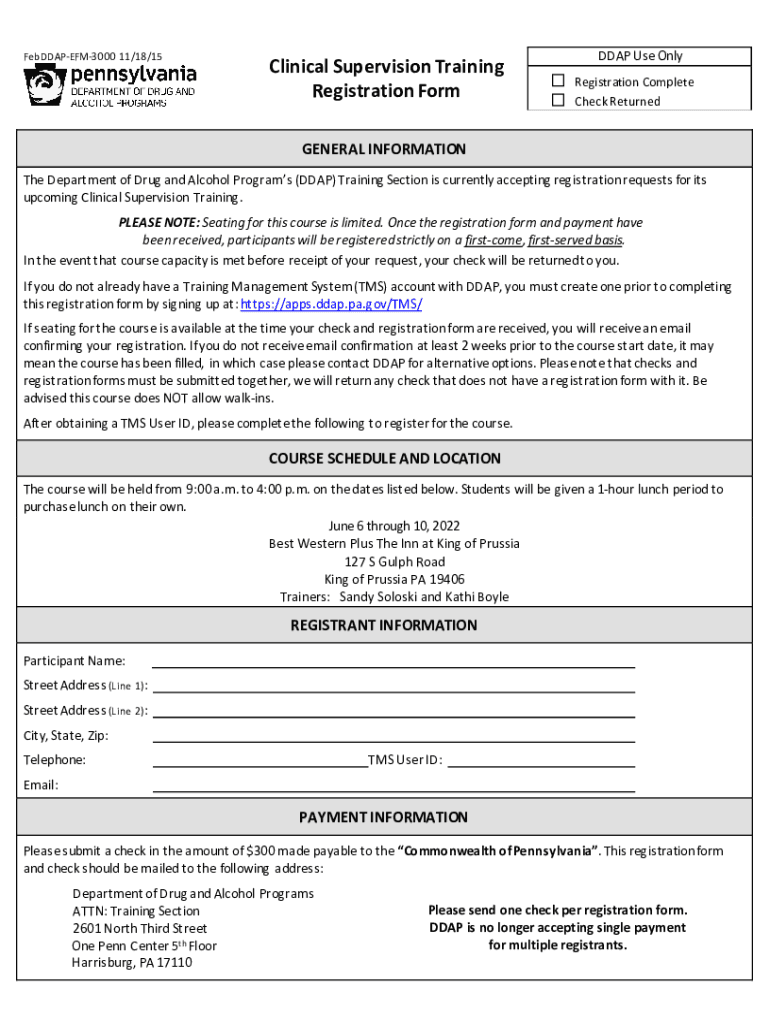 FebDDAPEFM3000 11/18/15Clinical Supervision Training Registration Formed Use Only Registration Complete Check ReturnedGENERAL INFORMATION The Department of Drug and Alcohol Programs (LDAP) Training