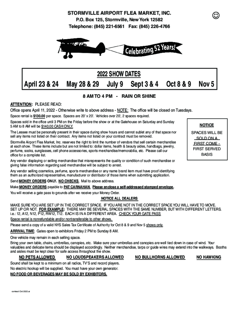 STARKVILLE AIRPORT FLEA MARKET, INC. P.O. Box 125, Starkville, New York 12582 Telephone: (845) 2216561 Fax: (845) 22647662022 SHOW DATES April 23 & 24May 28 & 29July 9Sept 3 & 4Oct 8 & 9Nov 58 AM