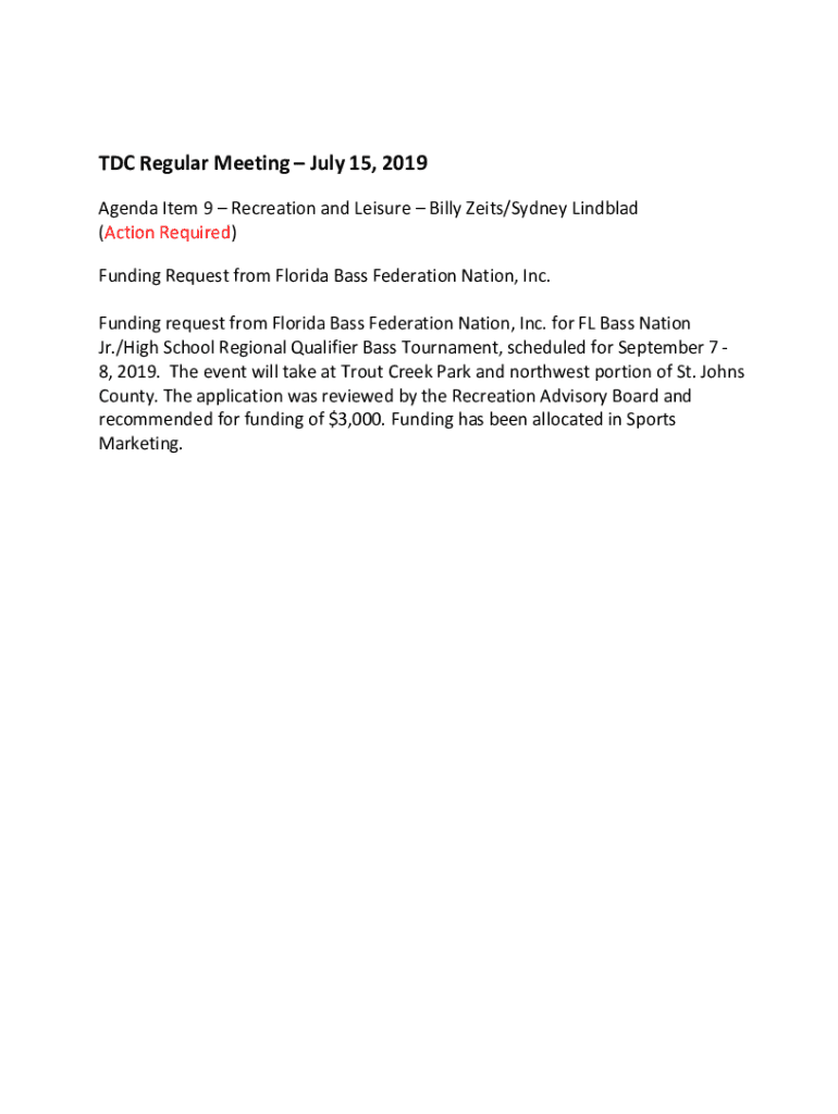 TDCRegularMeetingJuly15,2019 AgendaItem9RecreationandLeisureBillyZeits/SydneyLindblad (ActionRequired) FundingRequestfromFloridaBassFederationNation, Inc. FundingrequestfromFloridaBassFederationNation,