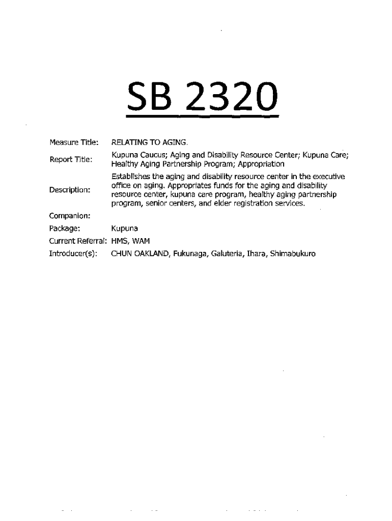 5B 2320 Measure Title:RELATING TO AGING. Report Title:Kahuna Caucus; Aging and Disability Resource Center; Kahuna Care; Healthy Aging Partnership Program; AppropriationDescription:Establishes the
