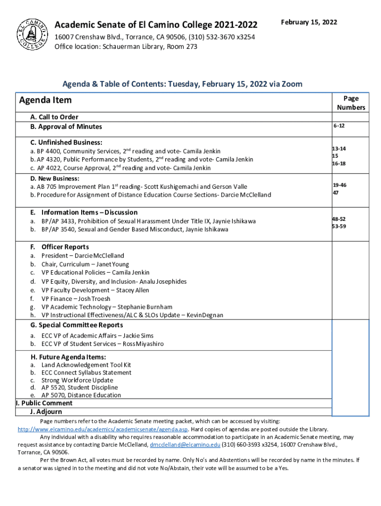 Academic Senate of El Camino College 20212022February 15, 202216007 Crenshaw Blvd., Torrance, CA 90506, (310) 5323670 x3254 Office location: Chairman Library, Room 273Agenda & Table of Contents: Tuesday,