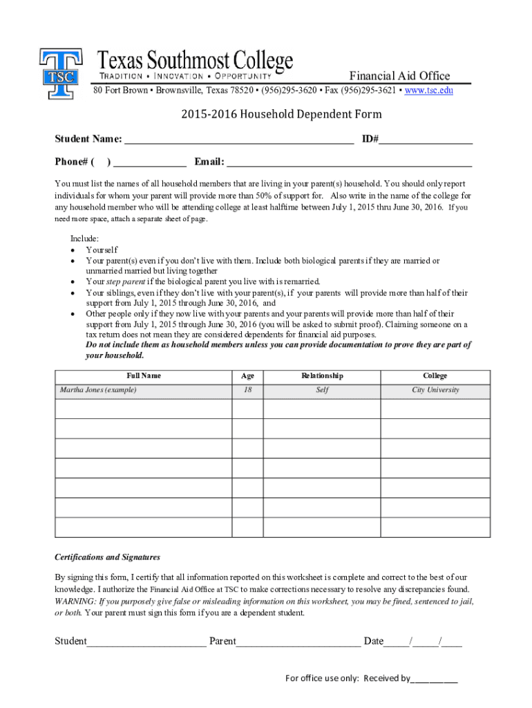 Financial Aid Office 80 Fort Brown Brownsville, Texas 78520 (956)2953620 Fax (956)2953621 www.tsc.edu20152016 Household Dependent FormStudent Name: ___ ID#___ Phone# () ___ Email: ___You must list