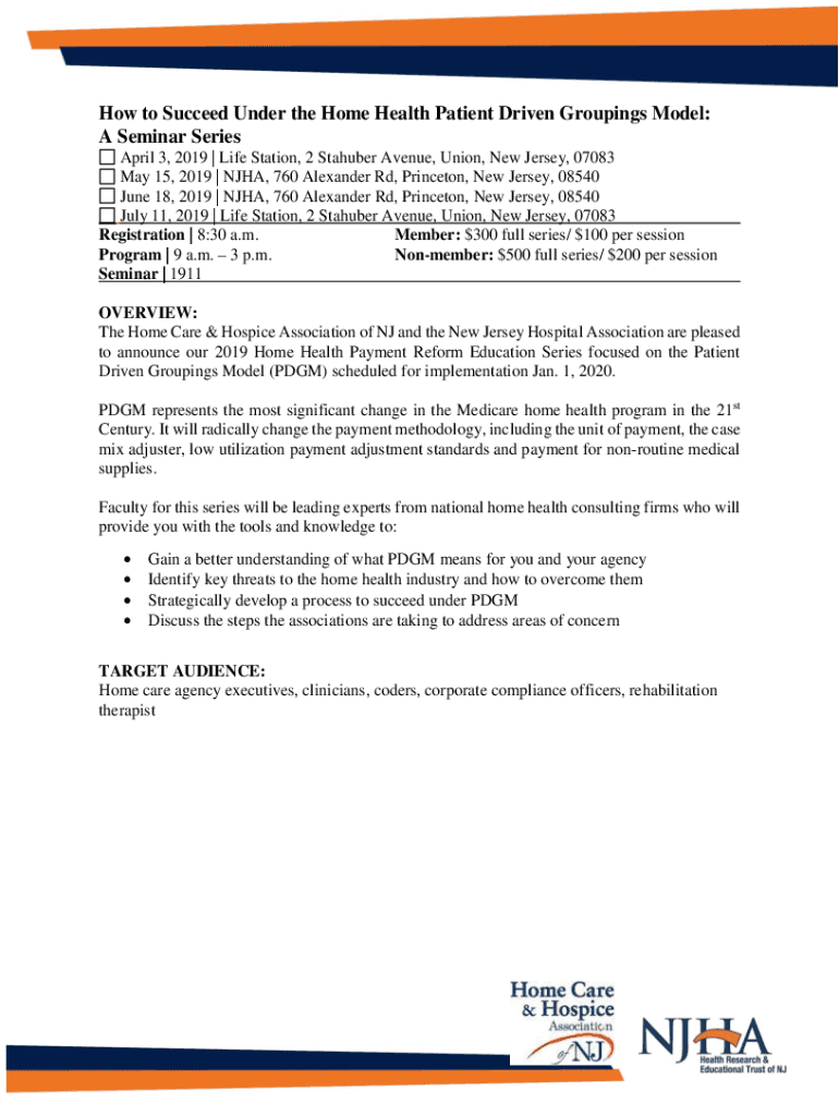 How to Succeed Under the Home Health Patient Driven Groupings Model: A Seminar Series April 3, 2019 | Life Station, 2 Stabber Avenue, Union, New Jersey, 07083 May 15, 2019 | NJ HA, 760 Alexander Rd,