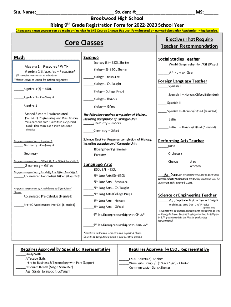 Stu. Name:___ Student #:___ MS:___Brook wood High School Rising 9 Grade Registration Form for 20222023 School Year changes to these courses can be made online via the BHS Course Change Request Form