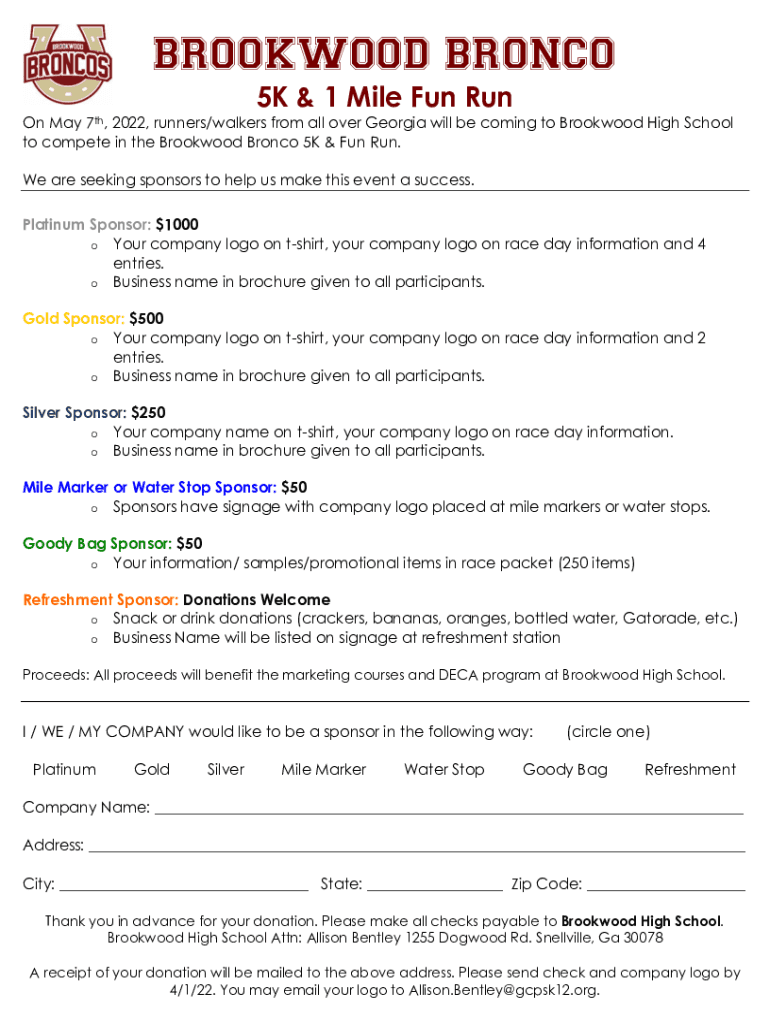 Brook wood bronco 5K & 1 Mile Fun Runyon May 7th, 2022, runners/walkers from all over Georgia will be coming to Brook wood High School to compete in the Brook wood Bronco 5K & Fun Run. We are seeking