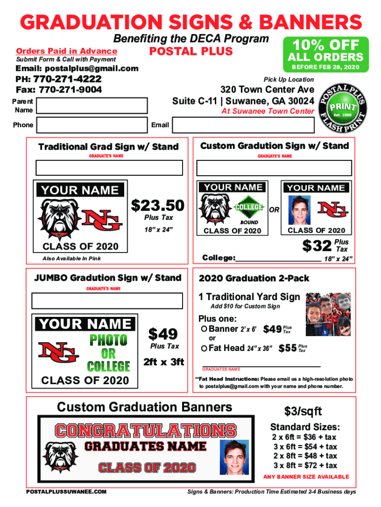 GRADUATION SIGNS & BANNERSBenefiting the DECA Program Orders Paid in Advance POSTAL PLUS10% OFFAL ORDERSSubmit Form & Call with PaymentEmail: postalplus@gmail.com PH:BEFORE FEB 28, 2020Pick Up Location320