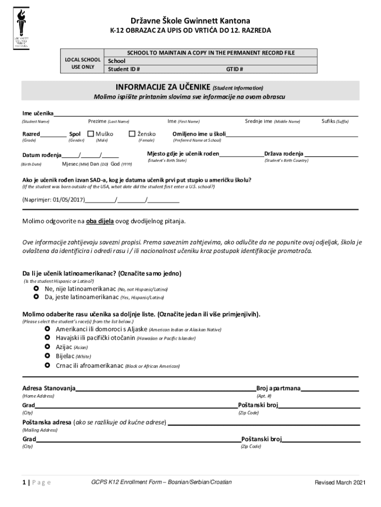 Get the free K12 Enrollment Form. Bos-Ser-Cro