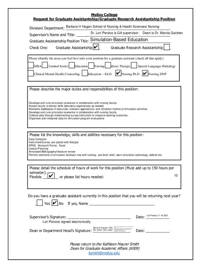 Molly College Request for Graduate Assistant ship/Graduate Research Assistant ship Position Barbara H Pagan School of Nursing & Health Sciences/ Nursing Division/ Department: ___Dr. Lori PepsiCo is
