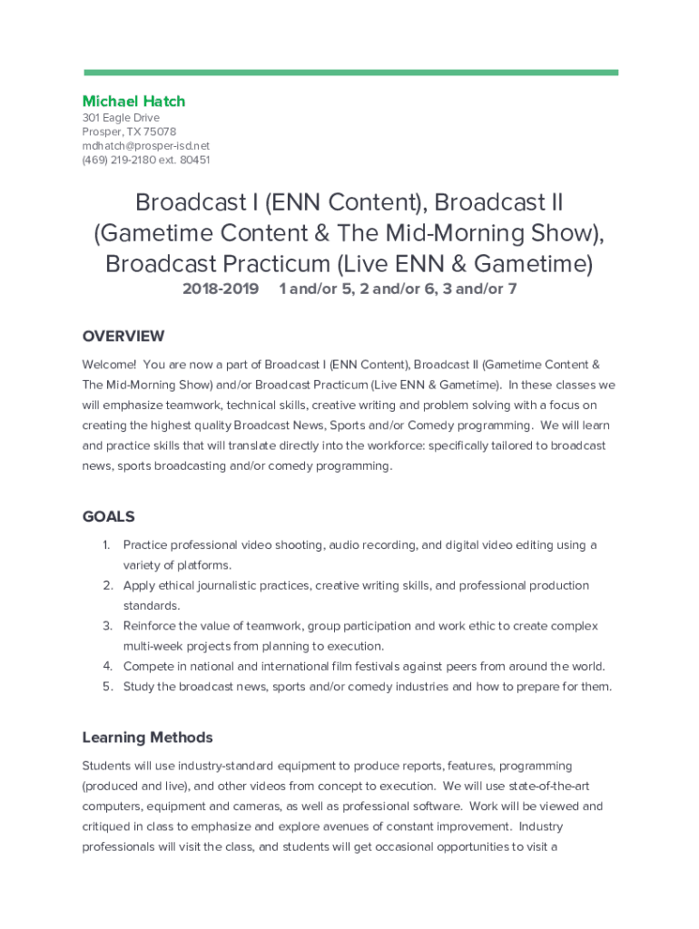 Michael Hatch301 Eagle Drive Prosper, TX 75078 mdhatch@prosperisd.net (469) 2192180 ext. 80451Broadcast I (END Content), Broadcast II (Game time Content & The Morning Show), Broadcast Practicum (Live