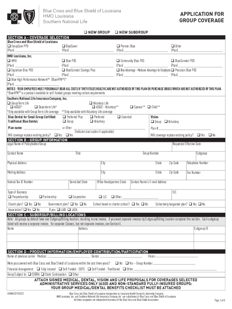 Blue Cross and Blue Shield of Louisiana HMO Louisiana Southern National Misapplication FOR GROUP Coverage NEW GROUP q NEW SUBGROUP SECTION A COVERAGE SELECTION Blue Cross and Blue Shield of Louisiana