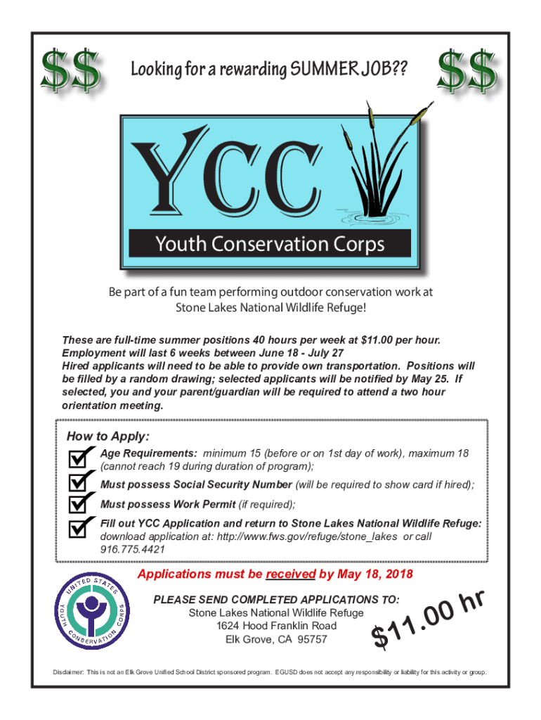 Looking for a rewarding SUMMER JOB??$$YCCYouth Conservation Corpse part of a fun team performing outdoor conservation work at Stone Lakes National Wildlife Refuge! These are full time summer positions