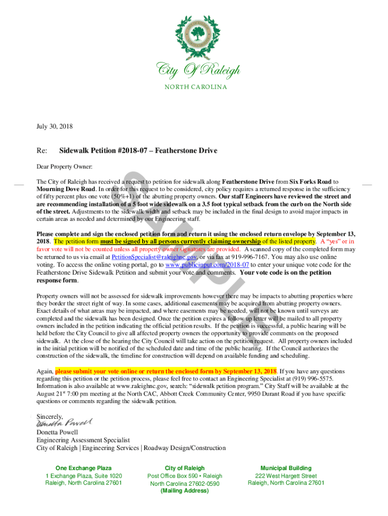 City Of Raleigh NORTH CAROLINAJuly 30, 2018Re:Sidewalk Petition #201807 Feather stone Driveler Property Owner’M Bathe City of Raleigh has received a request to petition for sidewalk along Feather