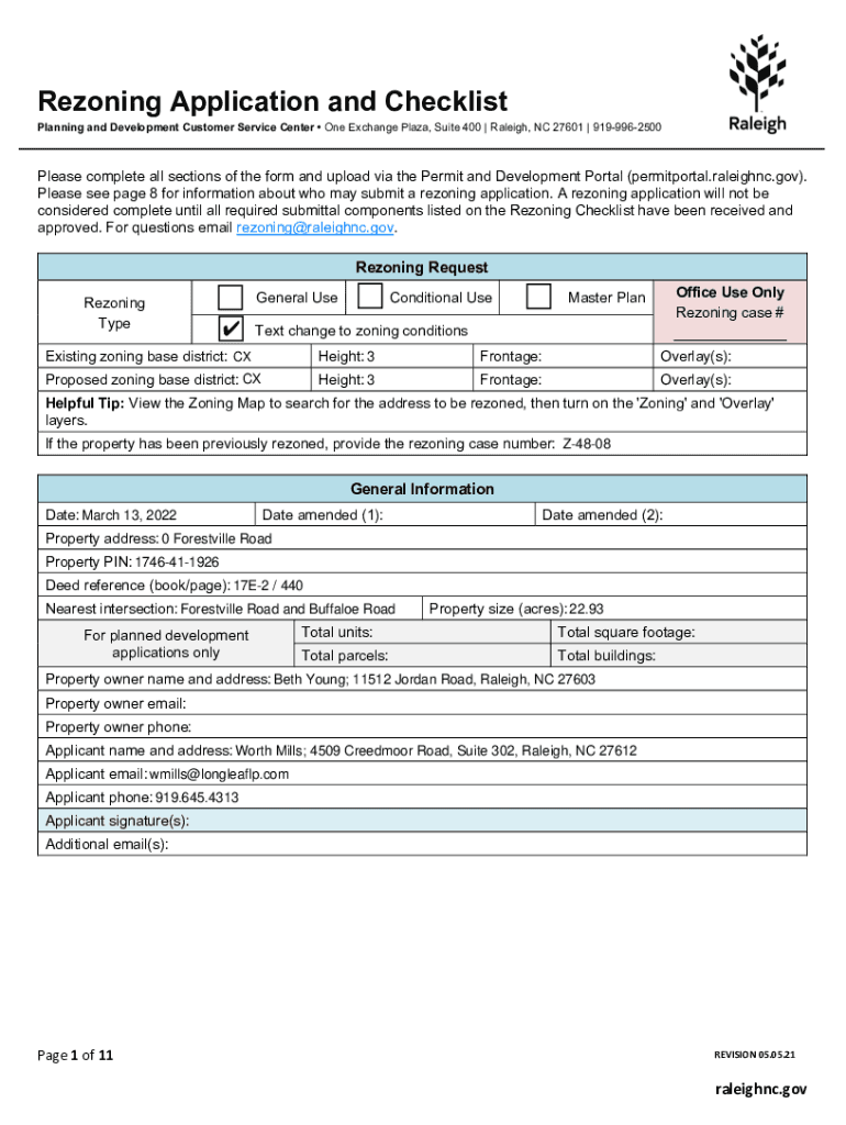 Complete the form by providing all required information such as property address, proposed land use, and zoning district