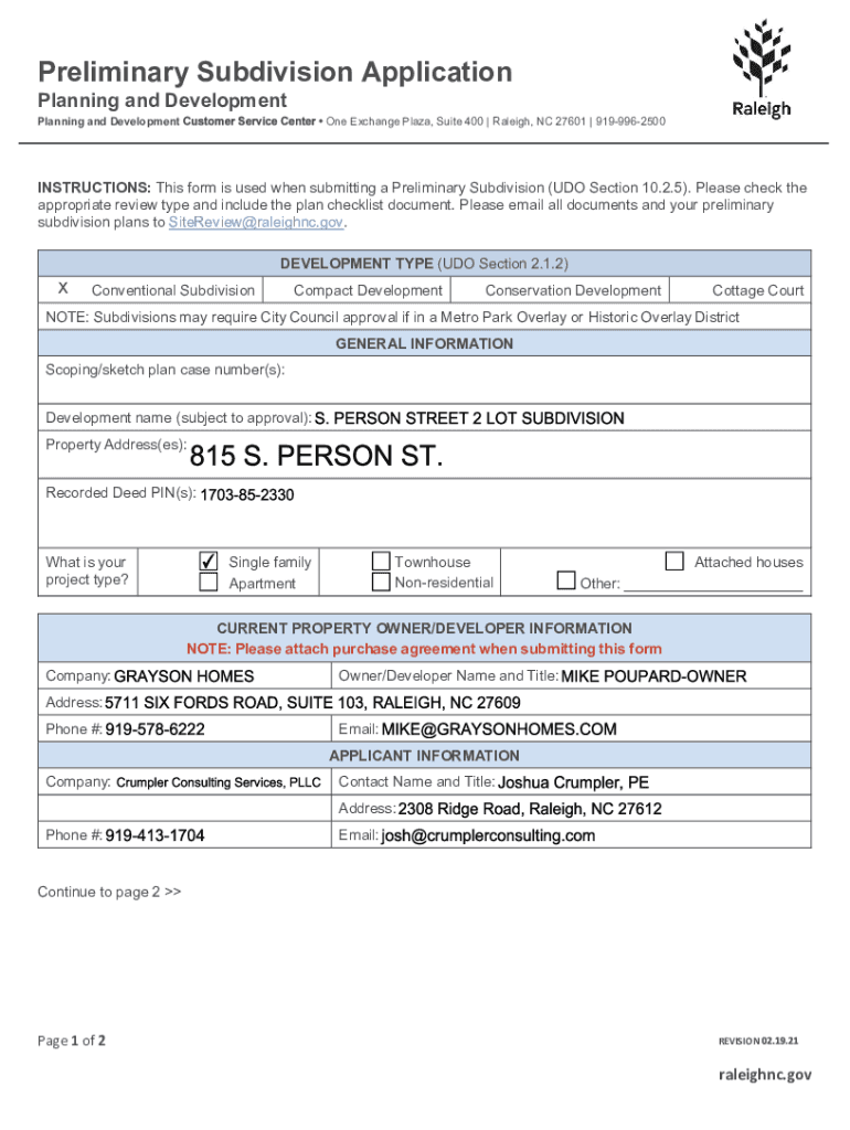 Preliminary Subdivision Application Planning and Development Planning and Development Exchange Plaza, Suite 400 | Raleigh, NC 27601 | 9199962500INSTRUCTIONS: This form is used when submitting a Preliminary