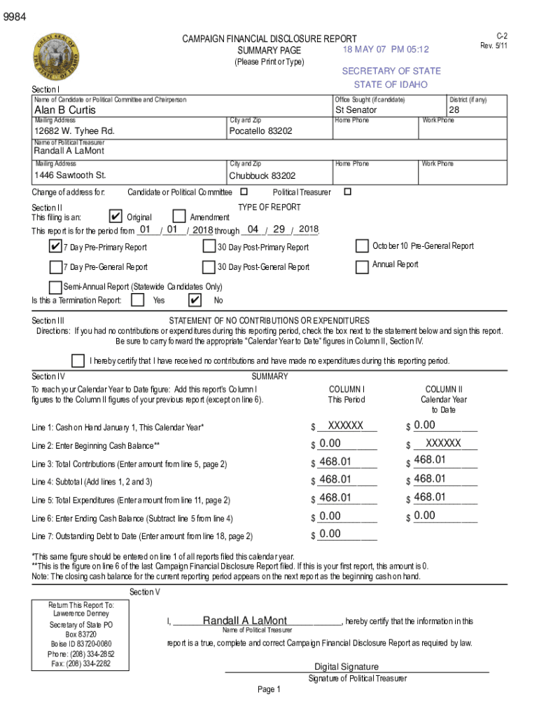 9984 C2 Rev. 5/11CAMPAIGN FINANCIAL DISCLOSURE REPORT 18 MAY 07 PM 05:12 SUMMARY PAGE (Please Print or Type) SECRETARY OF STATE OF IDAHOSection I Name of Candidate or Political Committee and ChairpersonOffice