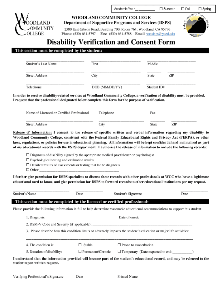 Get the free Disability Verification and Consent Form - Woodland Community ... - wcc yccd