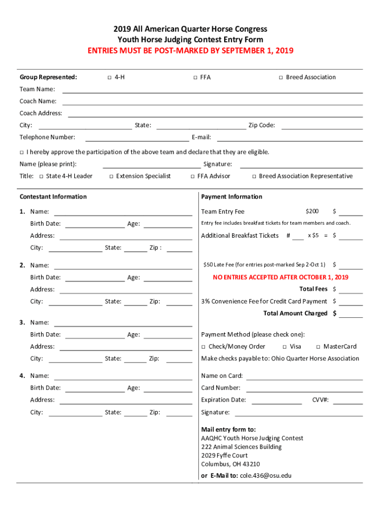 2019 All American Quarter Horse Congress Youth Horse Judging Contest Entry Form ENTRIES MUST BE POSTMARKED BY SEPTEMBER 1, 2019, Group Represented: 4H FFA Breed AssociationTeam Name: Coach Name: Coach