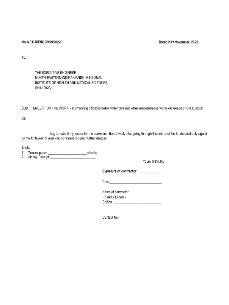 No. NEIGH/EGG/109/2022/Dated 23rd November, 2022To,THE EXECUTIVE ENGINEER NORTH EASTERN INDIRA GANDHI REGIONAL INSTITUTE OF HEALTH AND MEDICAL SCIENCES, SHILLINGS: TENDER FOR THE WORK: Dismantling
