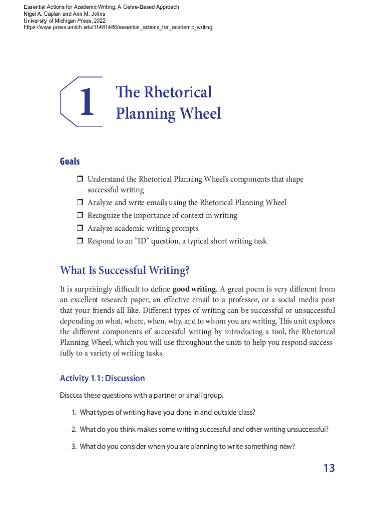Essential Actions for Academic Writing: A Generated Approach Nigel A. Ca plan and Ann M. Johns University of Michigan Press, 2022 https://www.press.umich.edu/11481486/essential_actions_for_academic_writing1The