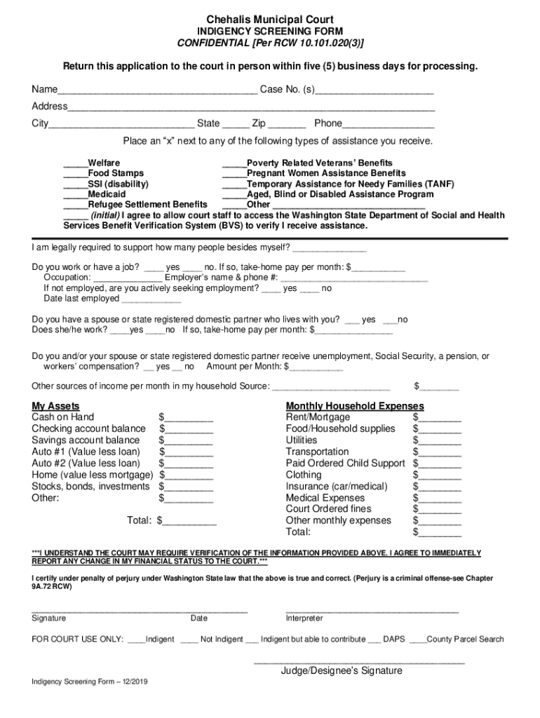 Information such as income, expenses, assets, and reasons for financial hardship must be reported on chehalis municipal court indigency.