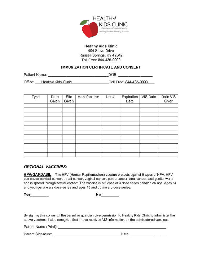 Healthy Kids Clinic 404 Steve Drive Russell Springs, KY 42642 Toll Free: 8444350900 IMMUNIZATION CERTIFICATE AND CONSENT Patient Name: ___DOB: ___ Office: ___Healthy Kids Clinic___ Toll Free: 8444350900TypeDate