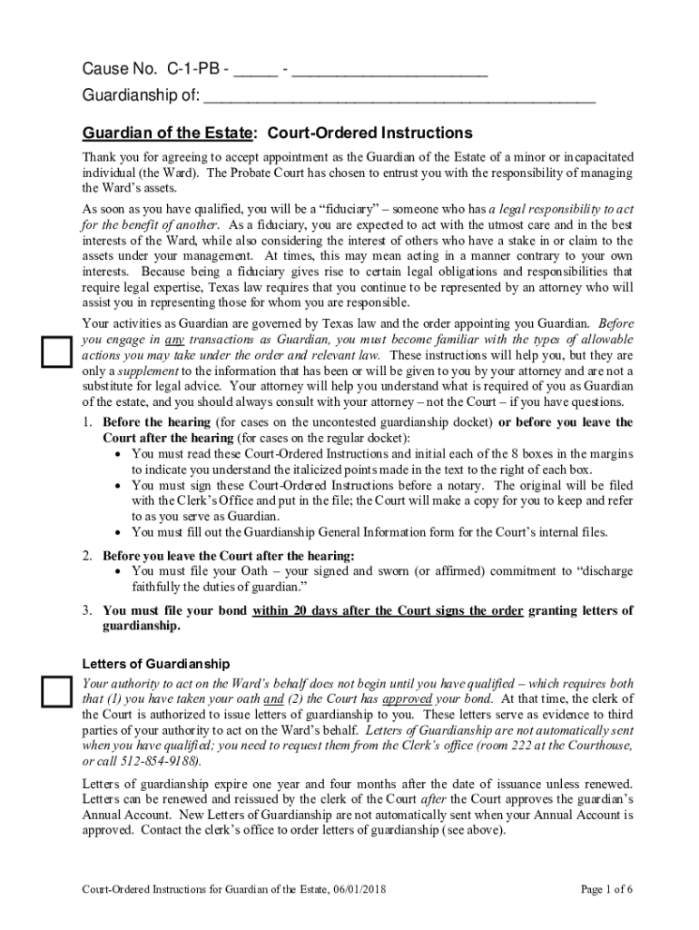 Cause No. C1PB ___ ___ Guardianship of: ___ Guardian of the Estate: CourtOrdered Instructions Thank you for agreeing to accept appointment as the Guardian of the Estate of a minor or incapacitated