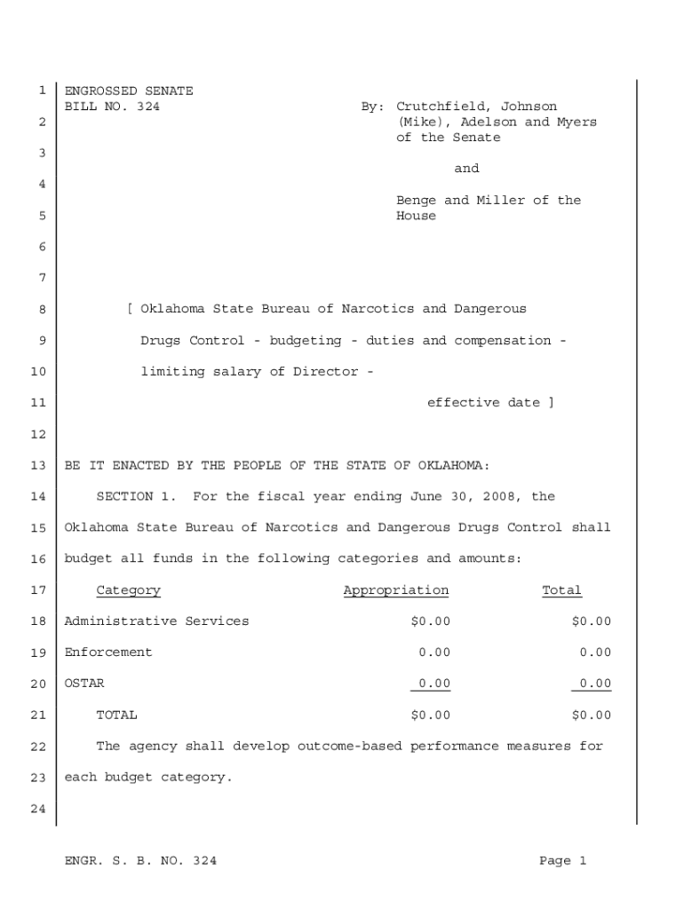 1ENGROSSED SENATE BILL NO. 3242By: Crutch field, Johnson (Mike), Abelson and Myers of the Senate3 and 4 Beige and Miller of the House5 6 7[Oklahoma State Bureau of Narcotics and Dangerous8Drugs Control