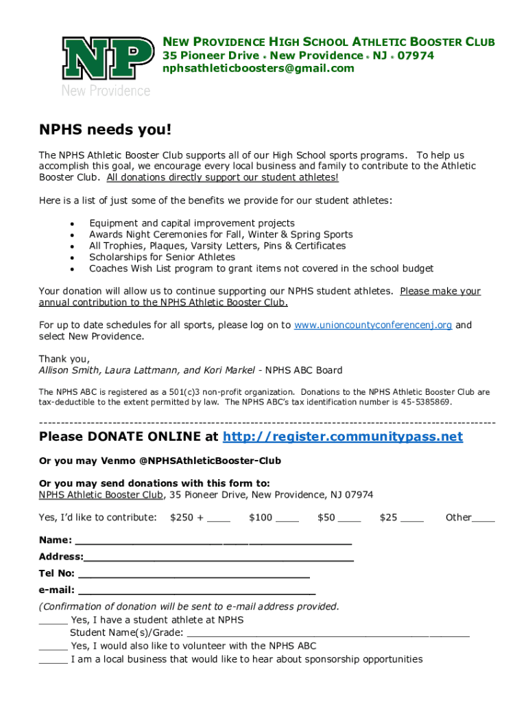 NEW PROVIDENCE HIGH SCHOOL ATHLETIC BOOSTER CLUB 35 Pioneer Drive New Providence NJ nphsathleticboosters@gmail.com07974NPHS needs you! The NHS Athletic Booster Club supports all of our High School