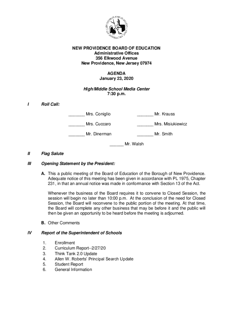 NEW PROVIDENCE BOARD OF EDUCATION Administrative Offices 356 Elwood Avenue New Providence, New Jersey 07974 AGENDA January 23, 2020, High/Middle School Media Center 7:30 p.m. Roll Call: ___ Mrs. Congo___