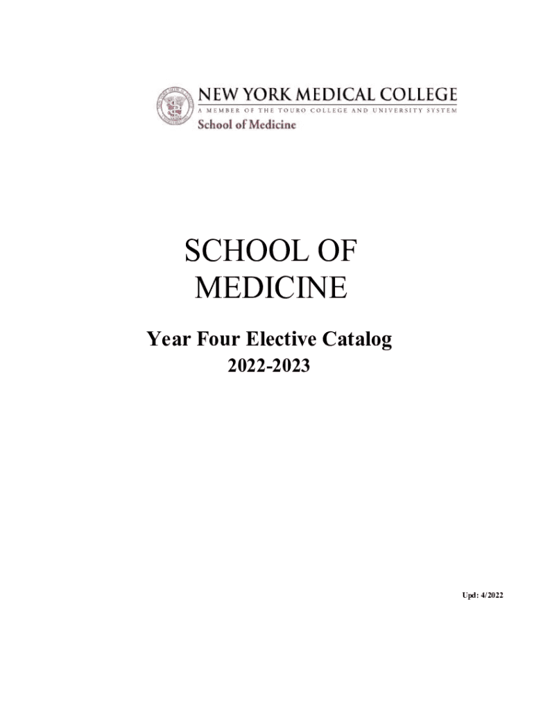 SCHOOL OF MEDICINE Year Four Elective Catalog 20222023Upd: 4/2022TABLE OF CONTENTS Introduction Procedure for Elective Enrollment at NYC and Affiliated Sites Procedure for Elective Enrollment in Unaffiliated