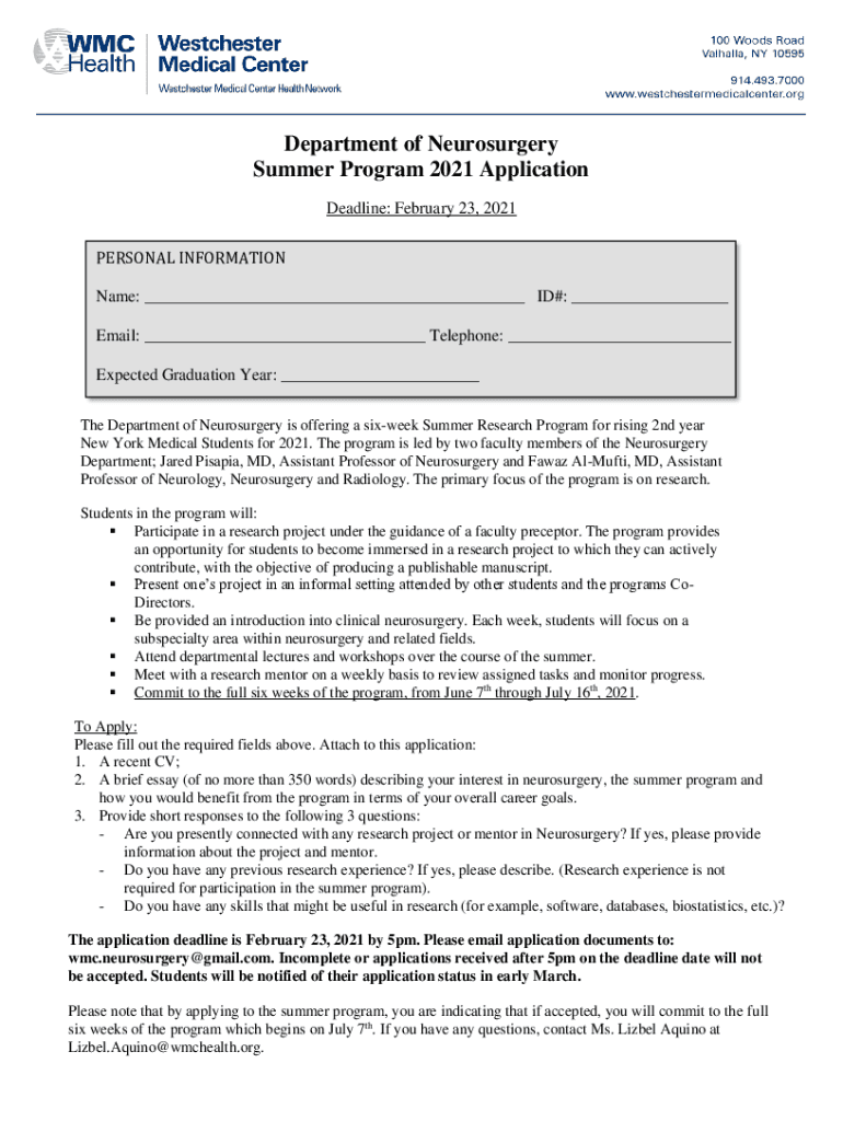 Department of Neurosurgery Summer Program 2021 Application Deadline: February 23, 2021, PERSONAL INFORMATION Name: ___ ID#: ___ Email: ___ Telephone: ___ Expected Graduation Year: ___ The Department