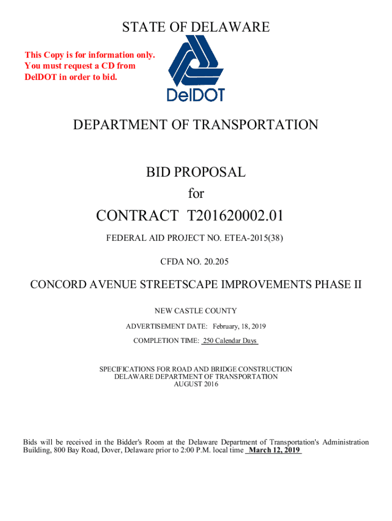 STATE OF DELAWARE This Copy is for information only. You must request a CD from Del DOT in order to bid. DEPARTMENT OF TRANSPORTATION BID PROPOSAL contract T201620002.01 FEDERAL AID PROJECT NO. ETEA2015(38)