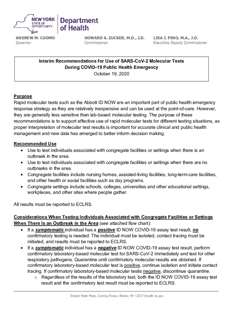 ANDREW M. CUOMO GovernorHOWARD A. TUCKER, M.D., J.D. Commissioner LISA J. PIANO, M.A., J.D. Executive Deputy CommissionerInterim Recommendations for Use of SARSCoV2 Molecular Tests During COVID-19