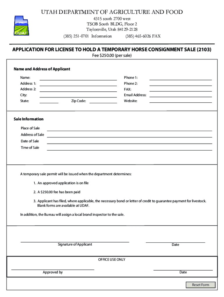 UTAH DEPARTMENT OF AGRICULTURE AND FOOD 4315 south 2700 west SOB South BLDG, Floor 2 Taylorsville, Utah 841292128 (385) 2510701 Information (385) 4656026 APPLICATION FOR LICENSE TO HOLD A TEMPORARY