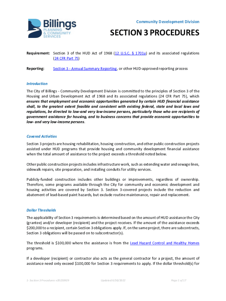 Community Development DivisionSECTION 3 PROCEDURES Requirement: Section 3 of the HUD Act of 1968 (12 U.S.C. 1701u) and its associated regulations (24 CFR Part 75) Reporting:Section 3 Annual Summary