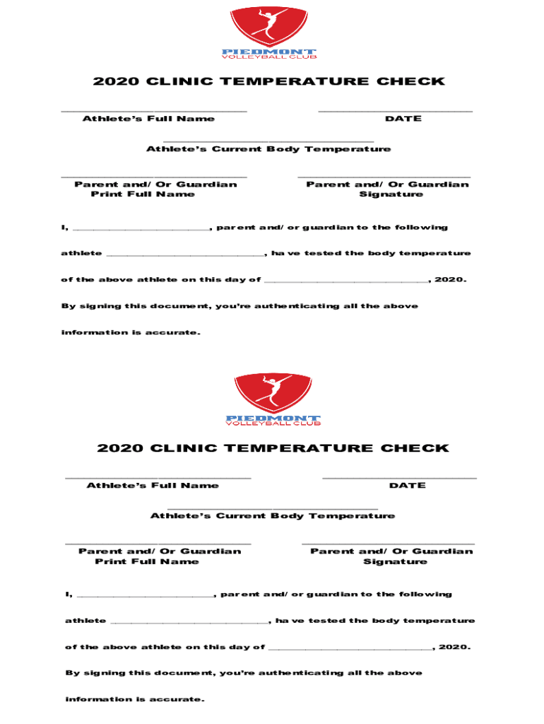 2020 CLINIC TEMPERATURE CHECK ___ Athletes Full Name___ DATE___ Athletes Current Body Temperature ___ Parent and/ Or Guardian Print Full Name___ Parent and/ Or Guardian Signature, ___, pa rent and/