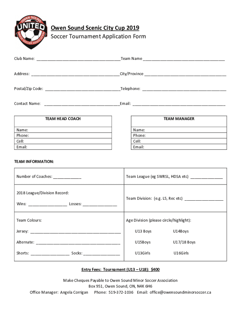 Owen Sound Scenic City Cup 2019 Soccer Tournament Application Formal Name: ___Team Name ___ Address: ___City/Province ___ Postal/Zip Code: ___Telephone: ___ Contact Name: ___Email: ___ TEAM HEAD COACHED