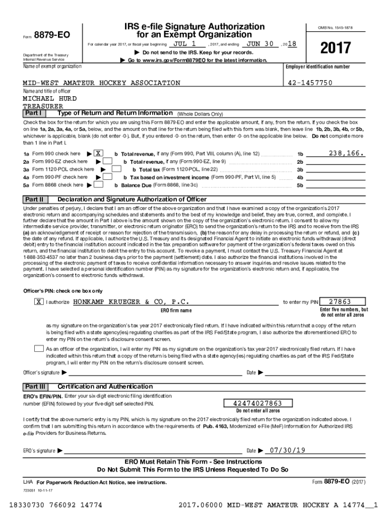 Form IRS file Signature Authorization for an Exempt Organization8879EOFor calendar year 2017, or fiscal year beginning 1, 2017, and ending OMB No. 15451878JUN 30, 20201718| Do not send to the IRS.