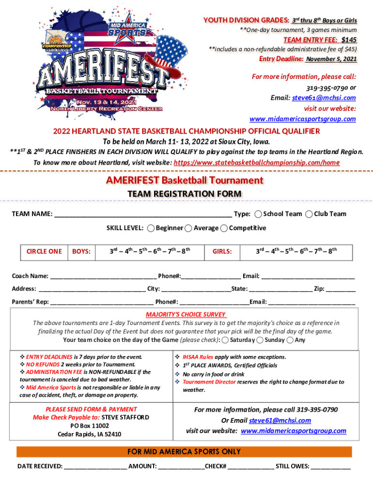 YOUTH DIVISION GRADES: 3rd through 8th Boys or Girls **One day tournament, 3 games minimum TEAM ENTRY FEE: $145 **includes a nonrefundable administrative fee of $45) Entry Deadline: November 5, 2021For