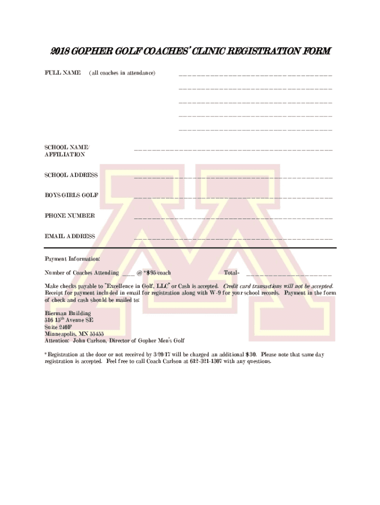 2018 GOPHER GOLF COACHES CLINIC REGISTRATION FORM FULL NAME(all coaches in attendance)___ ___ ___ ___ ___SCHOOL NAME/ AFFILIATION___SCHOOL ADDRESS___BOYS/GIRLS GOLF___PHONE NUMBER___EMAIL ADDRESS___Payment