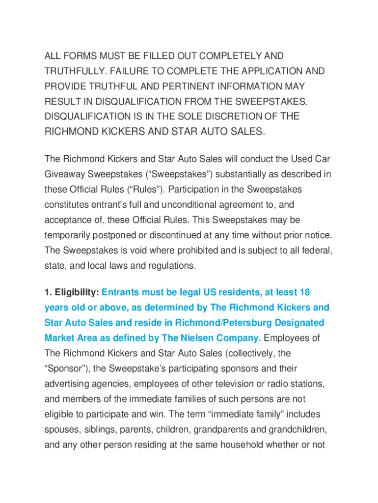 ALL FORMS MUST BE FILLED OUT COMPLETELY AND TRUTHFULLY. FAILURE TO COMPLETE THE APPLICATION AND PROVIDE TRUTHFUL AND PERTINENT INFORMATION MAY RESULT IN DISQUALIFICATION FROM THE SWEEPSTAKES. DISQUALIFICATION